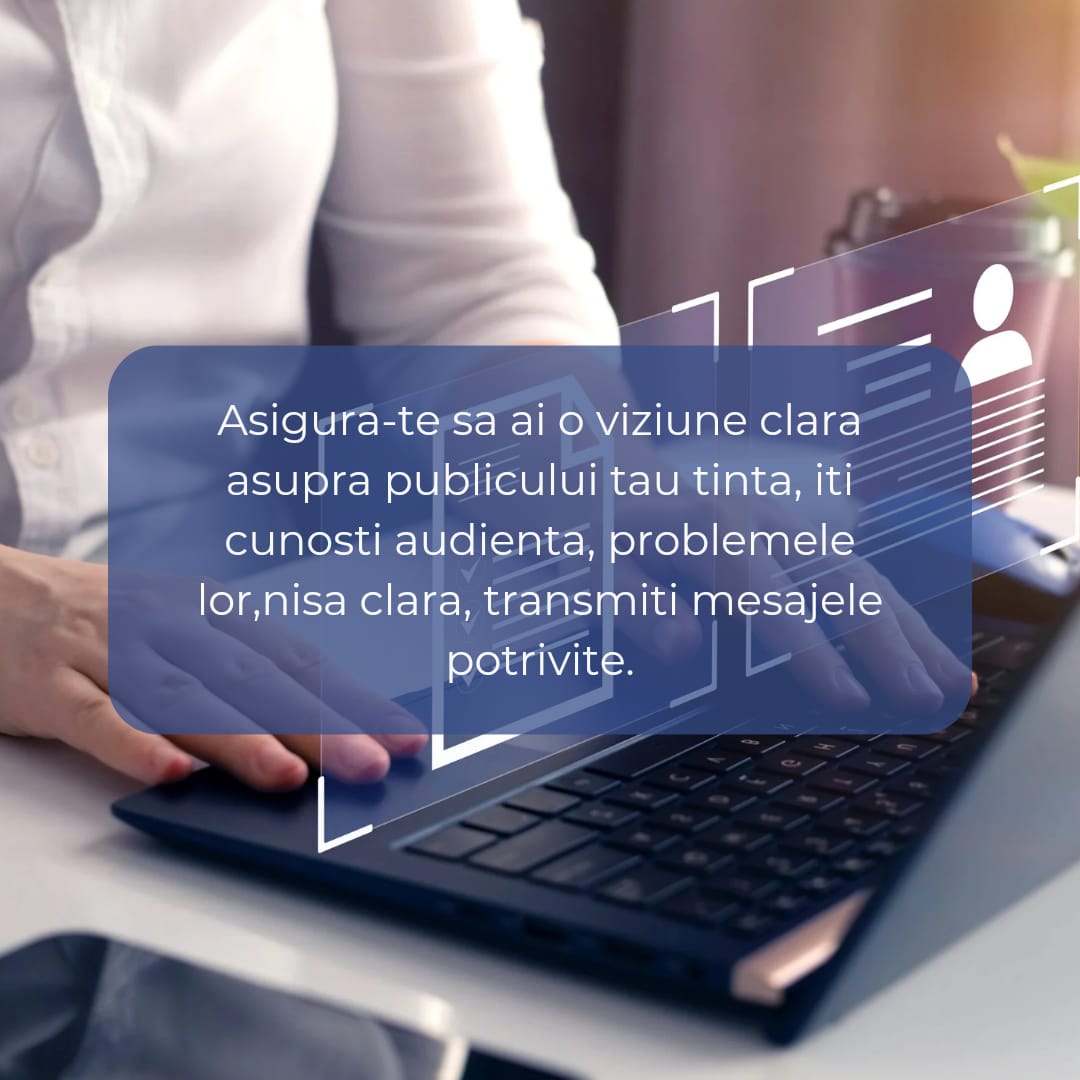 Multi antreprenori se arunca in promovarea afacerii lor fara a avea o strategie clara in minte. Acest lucru duce de cele mai multe ori la eforturi nereusite si cheltuieli inutile. Inainte de a incepe orice campanie de promovare, asigura-te ca ai o viziune clara asupra publicului tinta, iti cunosti audienta, ai un avatar de client, ii cunosti problemele, ai o nisa clara, la fel si mesajul pe care doresti sa il transmiti si ca ai ales canalele de promovare potrivite pentru afacerea ta.